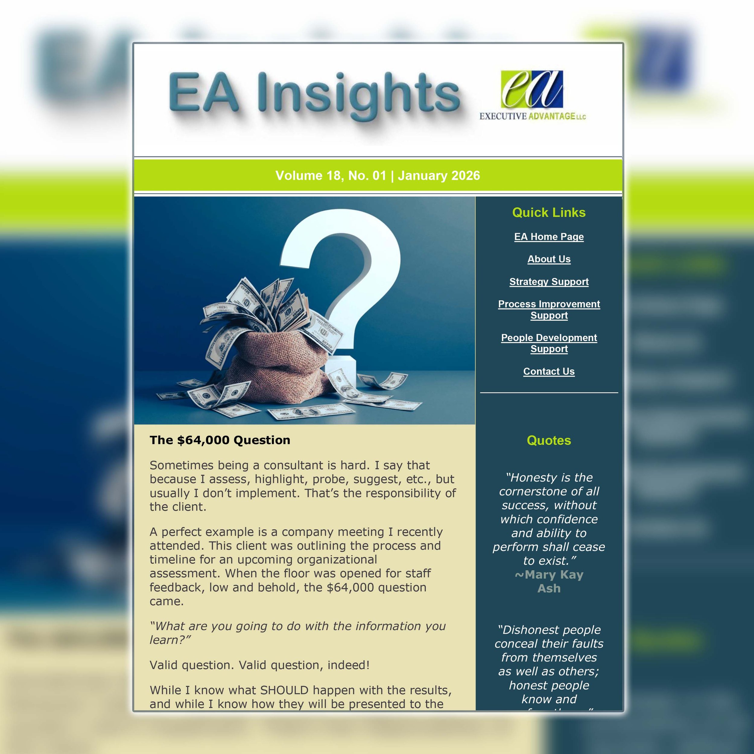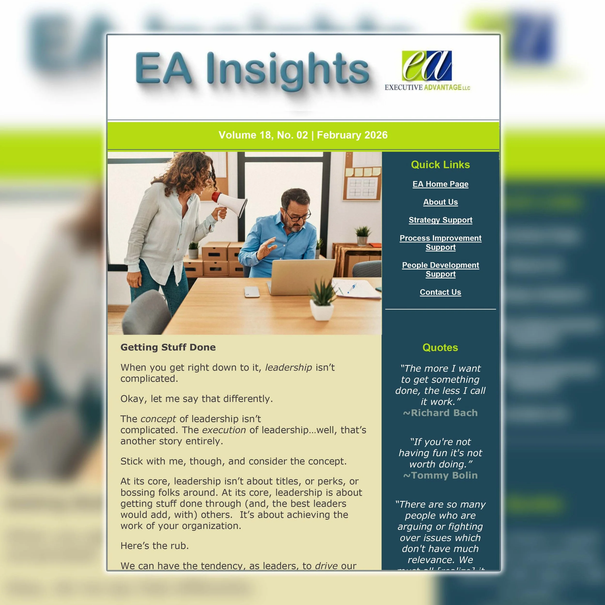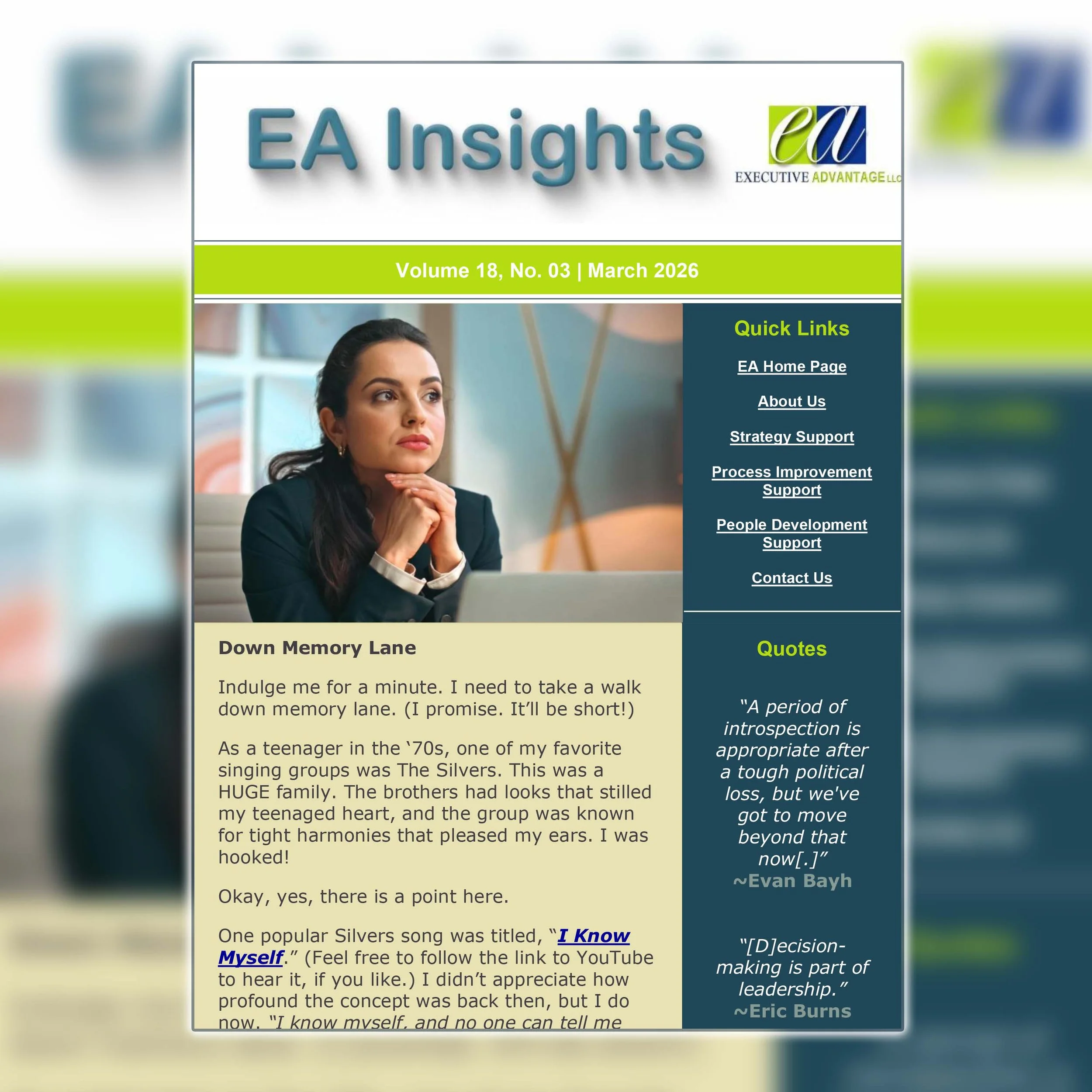 Don't miss the latest edition of EA Insights, the monthly online newsletter of Executive Advantage. Each edition offers brief articles on leadership, management, process improvement, professional and personal growth, and other areas critical to your success and the success of your organization.